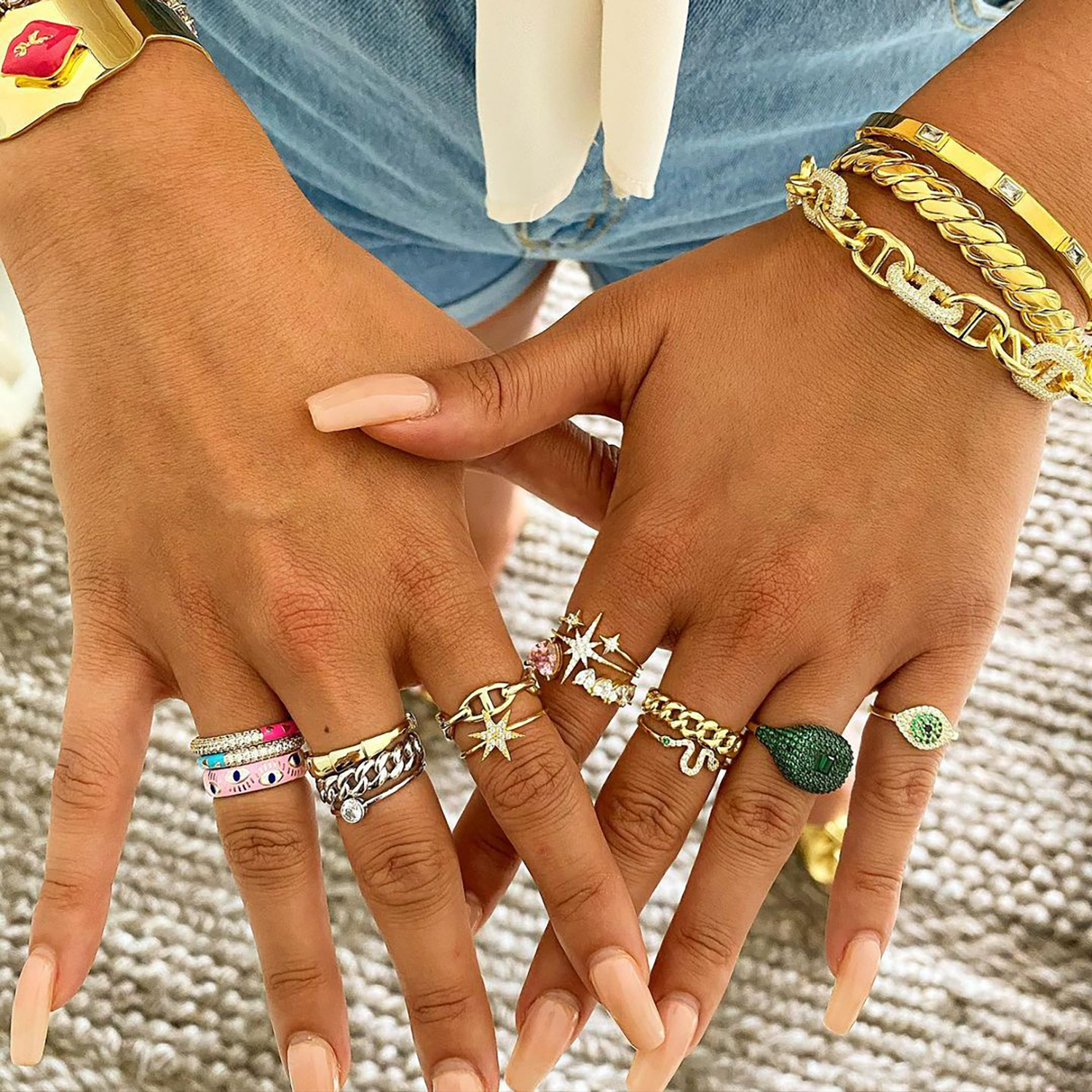 We've all been there—you're scrolling through your feed and stop dead in your tracks because one of your girls is wearing something you NEED to know more about. Before sharing that next selfie, level up with our Bae Got Bling Crystal Ring. Her dual finish style, which includes a fabulous pink enamel dip sprinkled with golden hearts on one half and a sea of perfect clear pavé crystals on the other, means she's got twice the personality of your average piece of flair. Now sit back and let the likes roll in!
