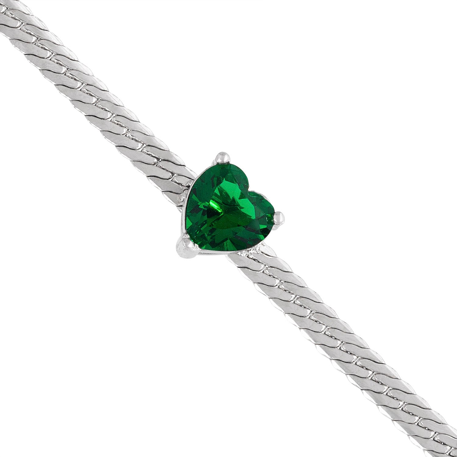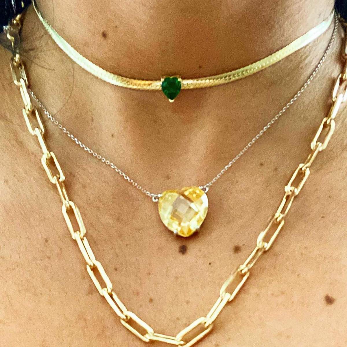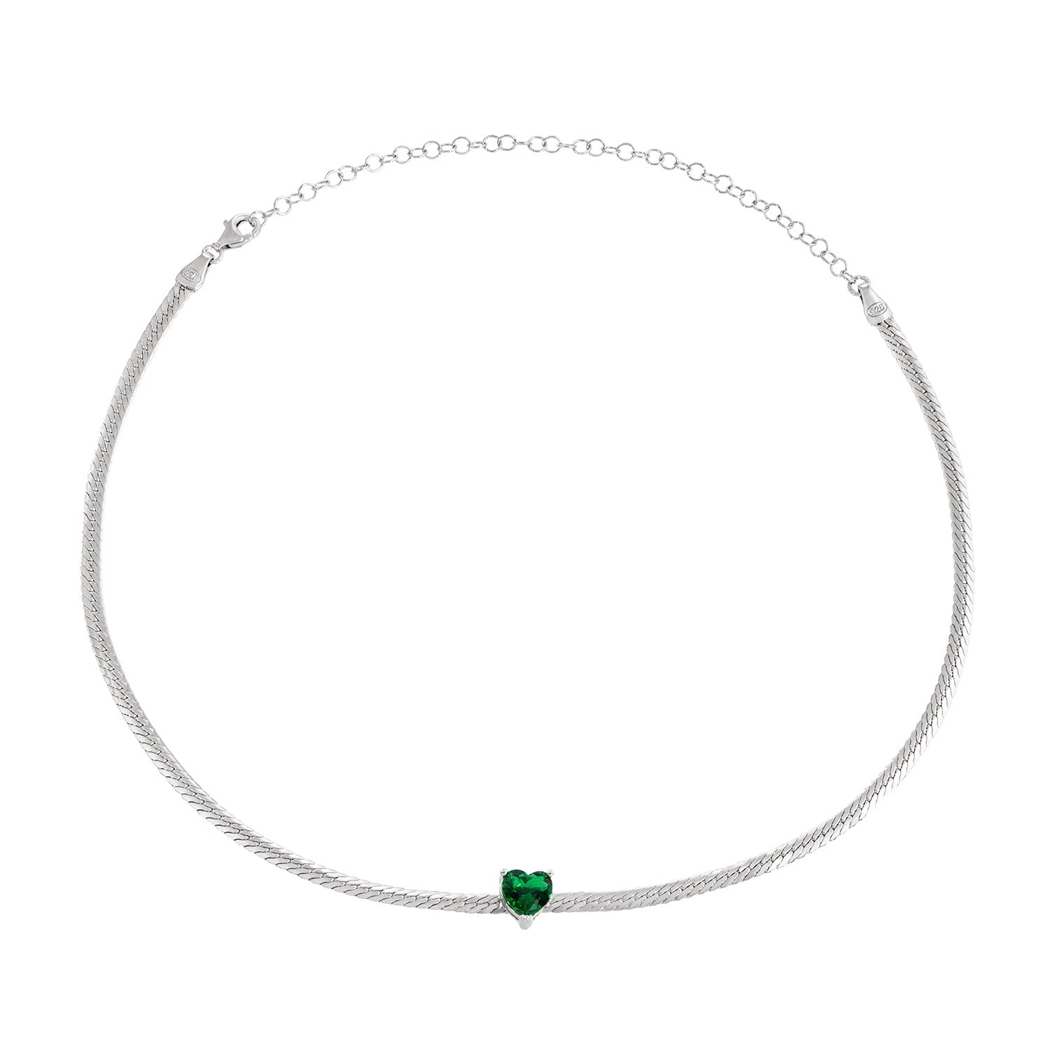 Close your eyes and envision paradise: the lushest, greenest tropical leaves, swaying palm trees, a natural bouquet of flora and aroma that lights the air in vibrant ecstasy. This is the heart of the Oasis. Our sweetest choker sparkles with an emerald green crystal in the shape of a classic heart, radiant on a herringbone chain choker. Demure enough for everyday but always ready to get wild when exciting evening plans take shape.