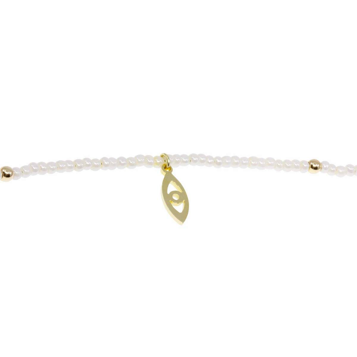 Let your divine spirit shine through in all that you do. The pairing of heavenly white beads and an open eye charm in shining gold make for a truly transcendent look. Wear among layers of gold anklets for this subtle stunner to work its magic.